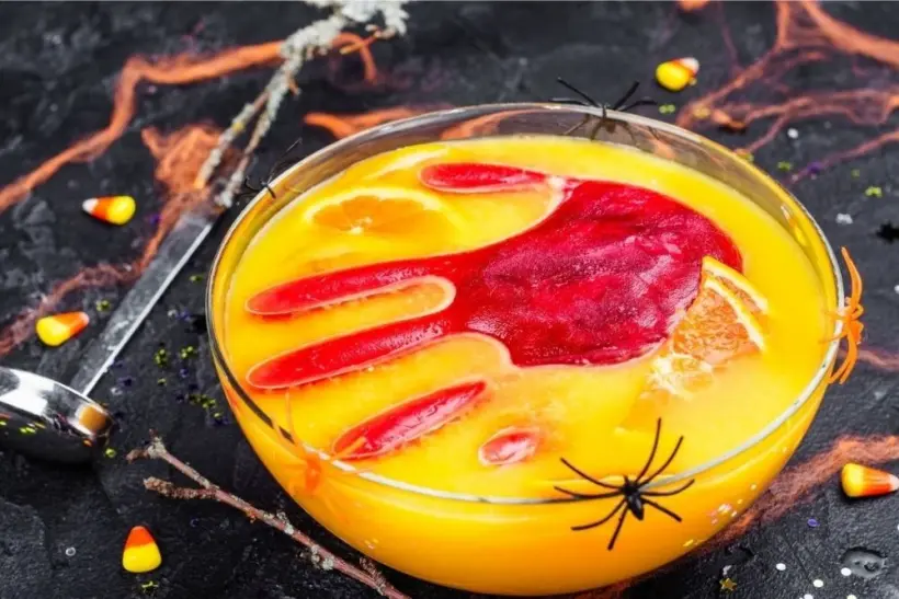Mischen Sie 1 Liter Orangensaft mit 200 Milliliter Ananassaft, etwas Zitronensaft und Crushed-Ice in einem Shaker. Füllen Sie das Getränk in die Schüssel. Falls Sie eine Bowle mit Alkohol machen möchten, mischen Sie jetzt den Sekt dazu, Ihr Geschmack bestimmt die Menge. Richtig schaurig wird es, wenn Sie einen Gummihandschuh mit Kirschsaft füllen und über Nacht in der Kühltruhe gefrieren lassen. Den Handschuh am nächsten Tag vorsichtig ablösen und die Kirschsaft-Hand in die Bowle geben.